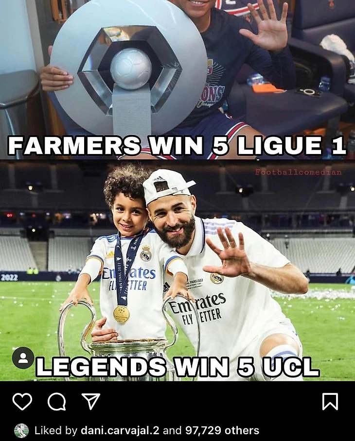 Все просто – фото с Мбаппе и подпись «Фермеры выигрывают Лигу 1 5 раз» (отсылка к издевательскому названию чемпионата Франции) и фото с Каримом Бензема и кубком ЛЧ: «Легенды выигрывают Лигу чемпионов 5 раз».