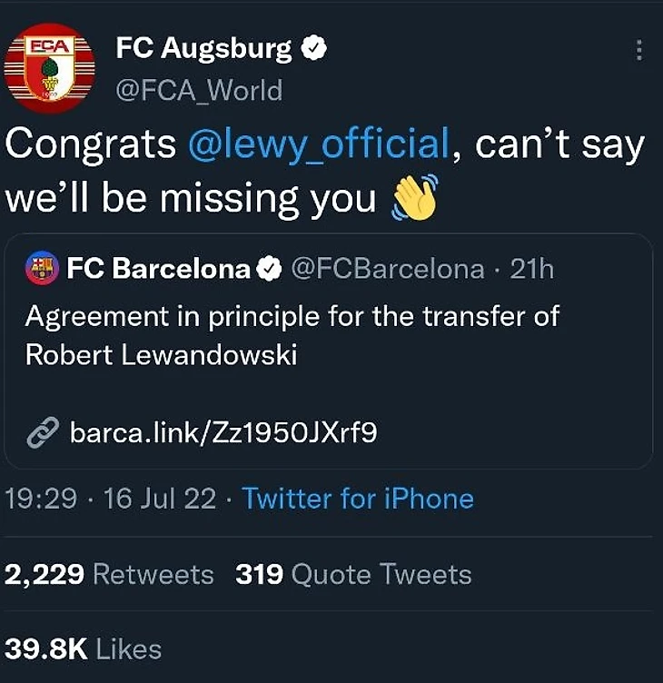 Неудивительно, что англоязычный твиттер клуба оставил вот этот реплай на твит «Барселоны» о договоренности с польским бомбардиром.
