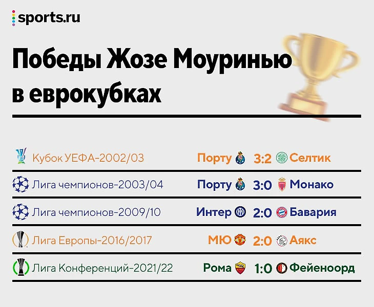 Моуринью – главный коллекционер еврокубков среди тренеров. Начал побеждать еще 20 лет назад