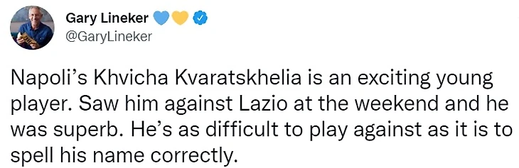 «Хвича Кварацхелия из «Наполи» – интересный молодой игрок. Видел его против «Лацио» на выходных, и он был великолепен. Играть против него так же сложно, как и правильно произнести его имя».