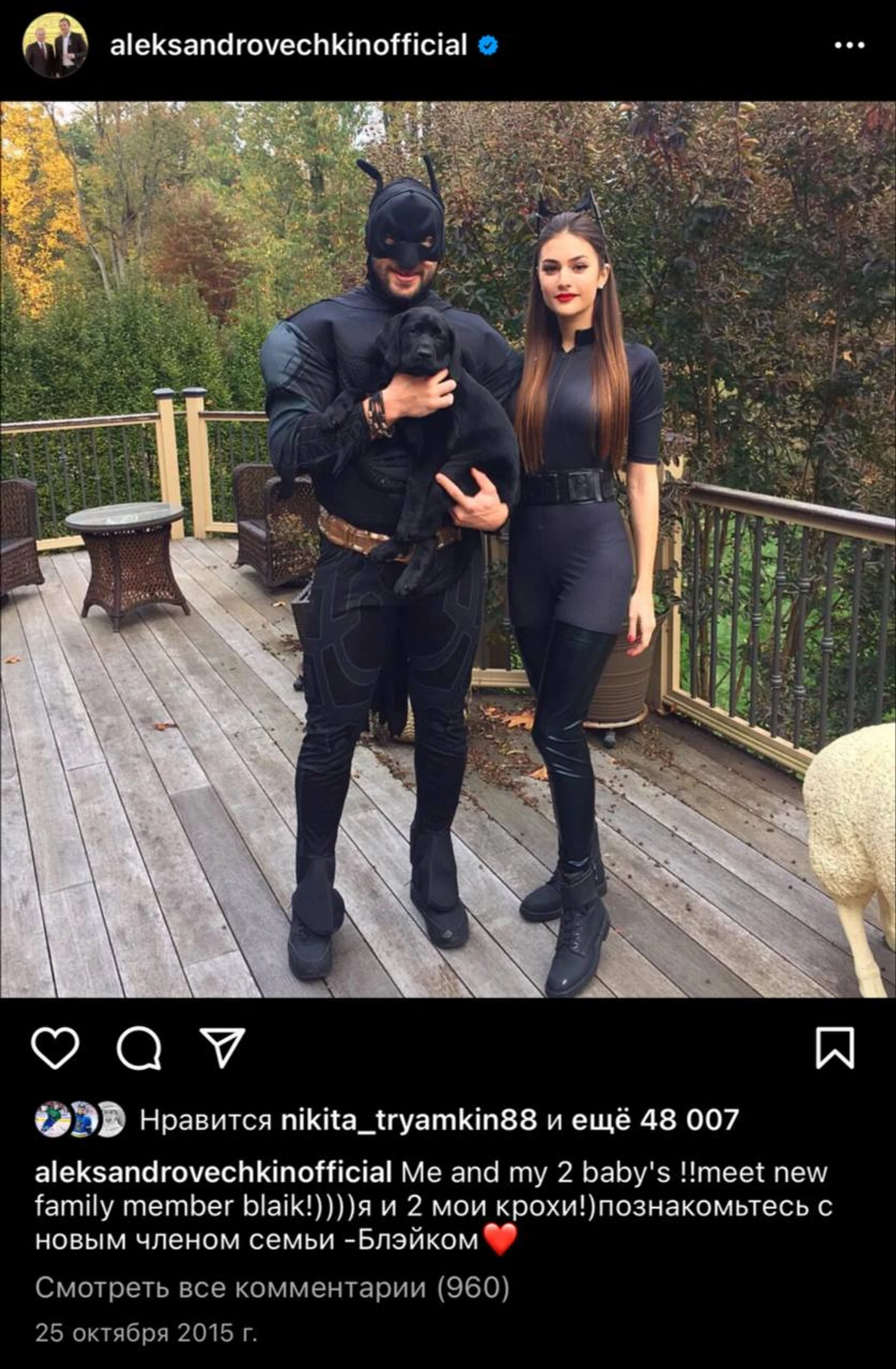 Первое появление Блэйка в соцсетях состоялось после вечеринки на Хэллоуин: Александр в костюме Бэтмена с щенком на руках, а Анастасия в образе женщины-кошки.
