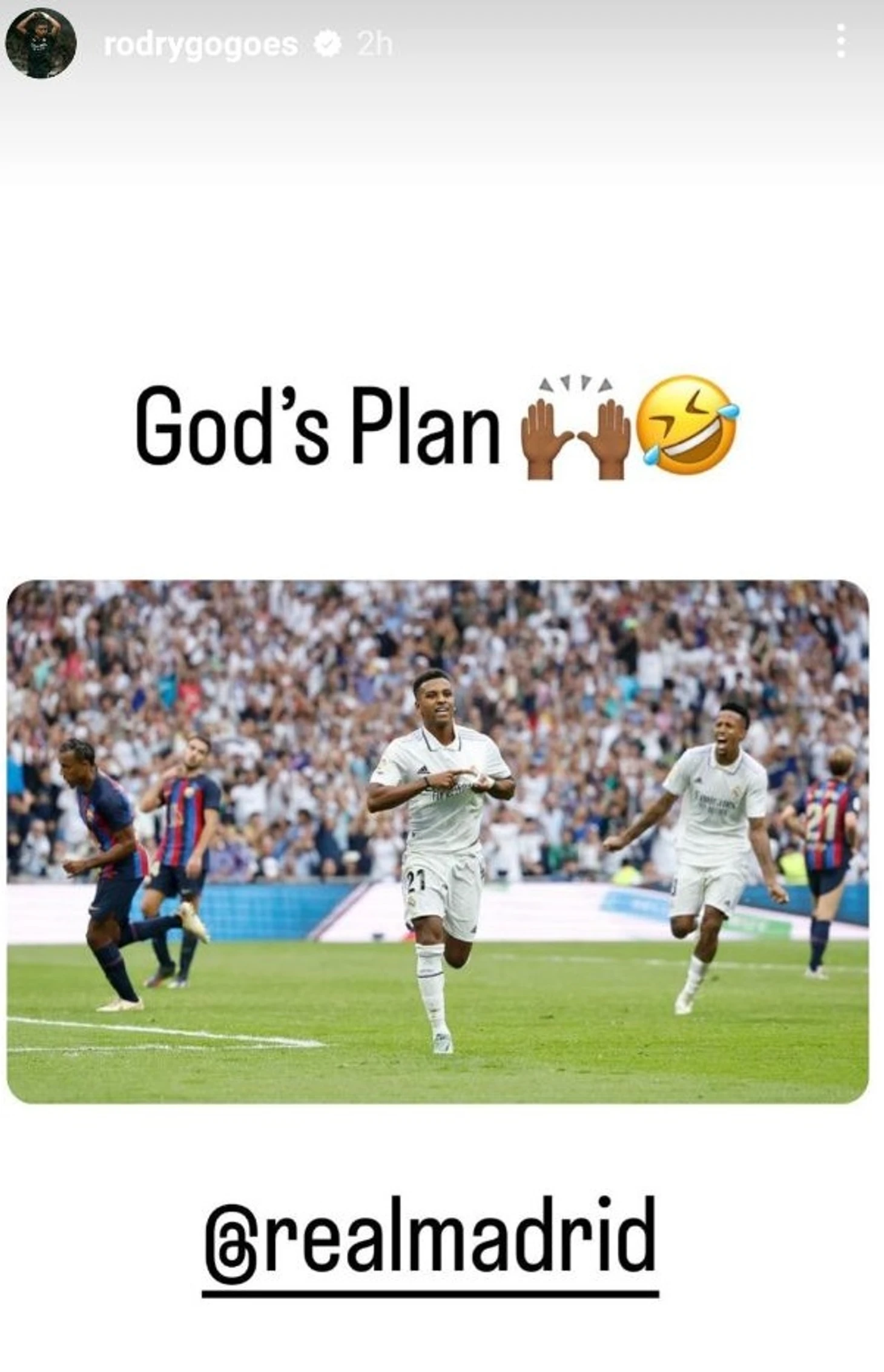А после игры игроки «Мадрида» троллили рэпера в соцсетях. Забивший третий мяч Родриго запостил сторис, написав God's Plan – это не только «План бога», но и знаменитый трек Дрейка.