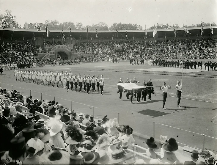 6 июля 1912 года. Стокгольм. Олимпийский стадион. Церемония открытия Игр. Делегация России (фото scif.se)
