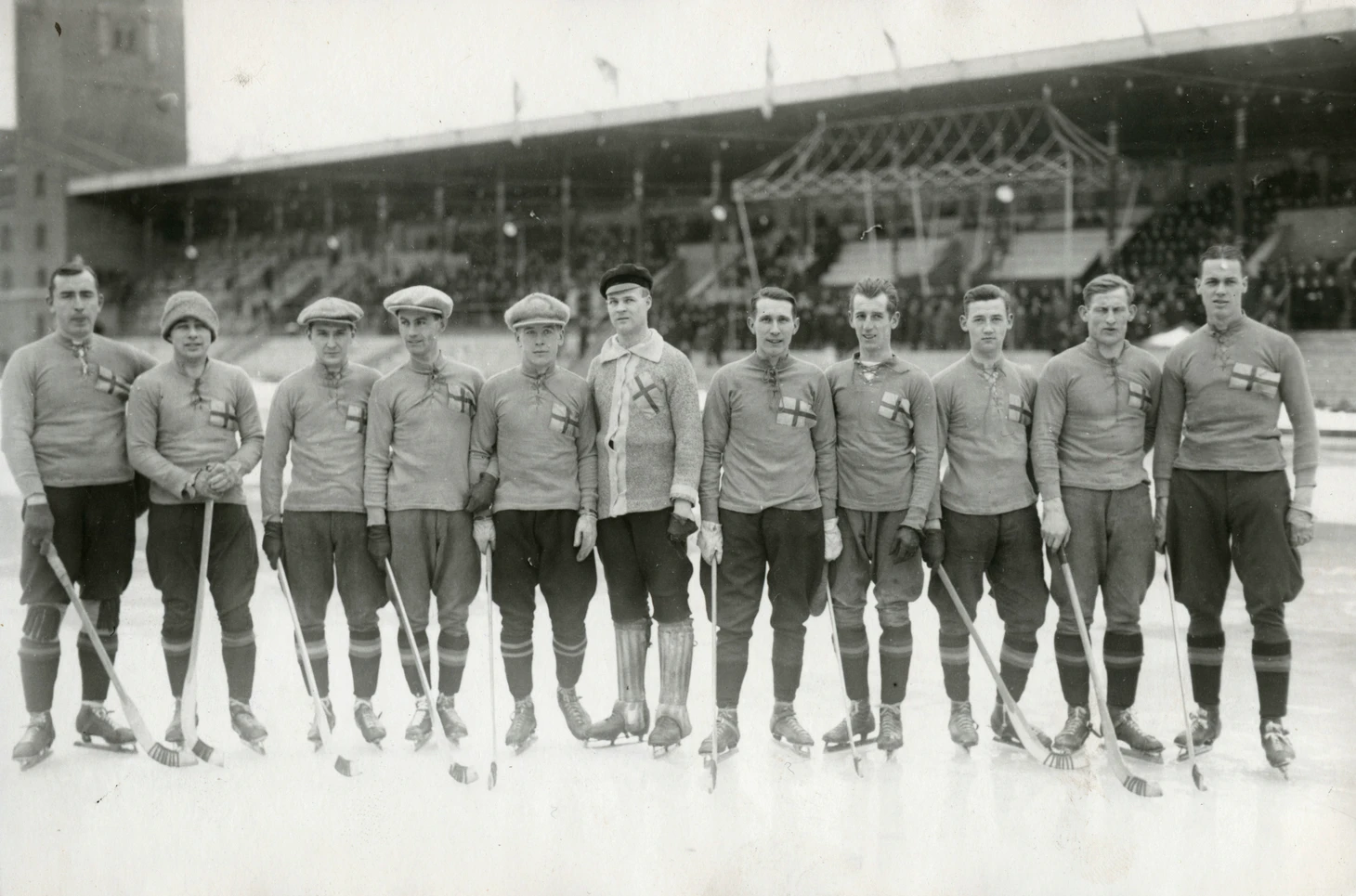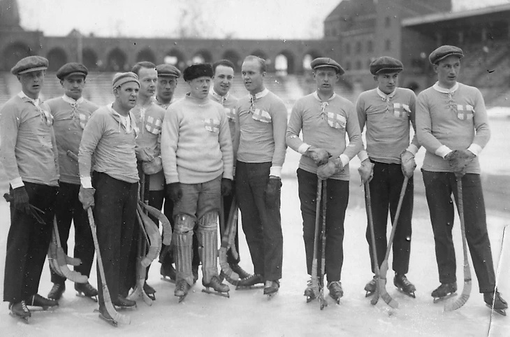 Февраль 1922 года. Стокгольм. Олимпийский стадион. Показательный матч по норвежскому варианту хоккея с мячом (7 на 7) в рамках VI Северных игр. Стокгольм - Норвегия - 7:2 (этот матч еще называют «Стокгольм - Христиания» или «Швеция - Норвегия»). Семерка шведов, которые играли в форме без какой-либо символики (scif.se)