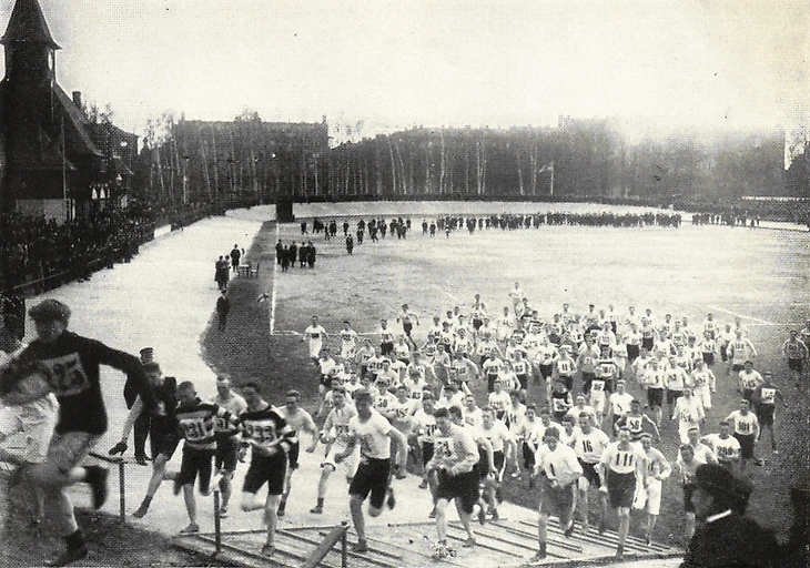 1908 год. Стокгольм. Стадион «Идроттспаркен». Масс-старт соревнований по кроссу (фото из VI тома «Энциклопедии по спорту, гимнастике и жизни на природе», серия «Скандинавская семейная книга», Стокгольм, 1946 год)