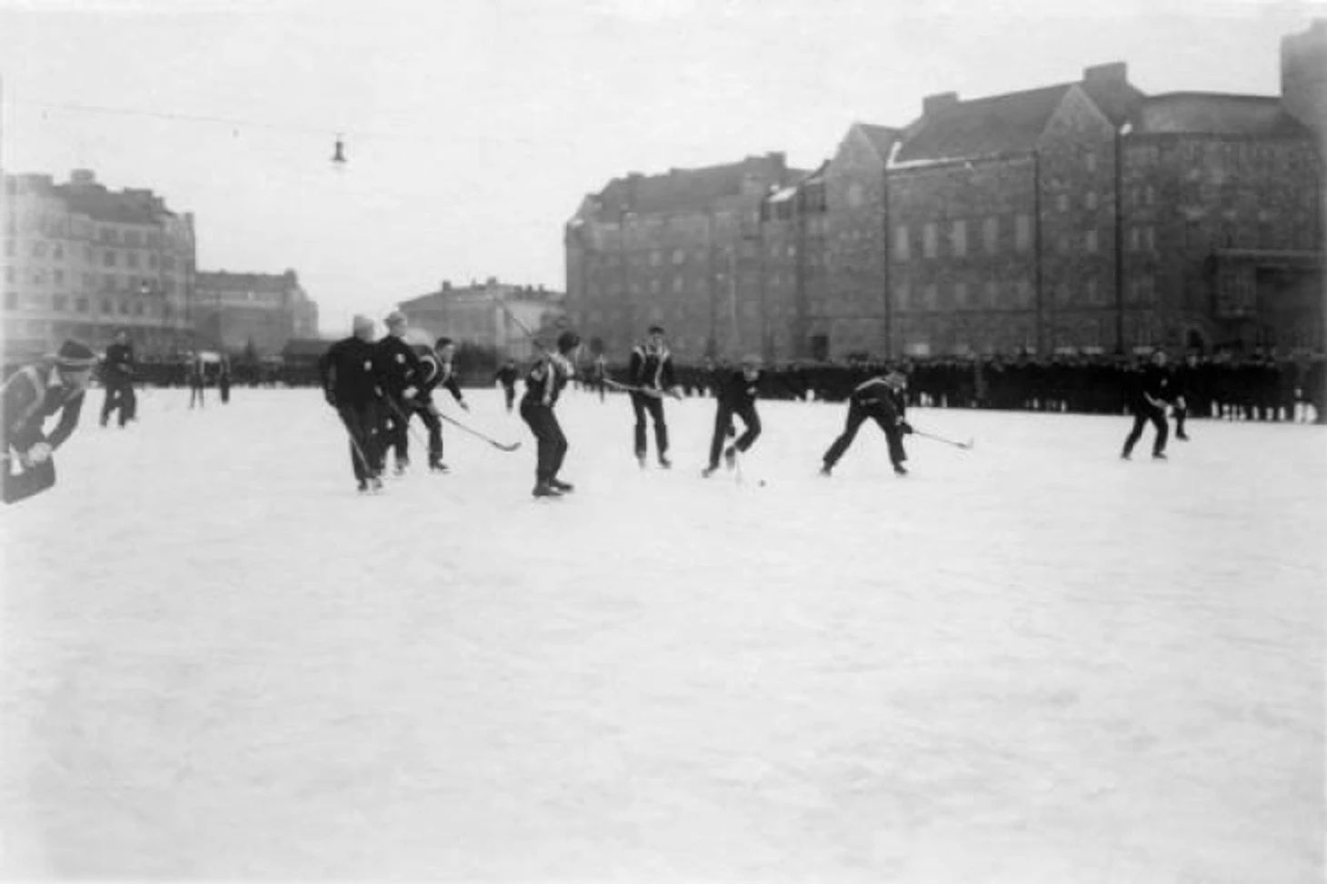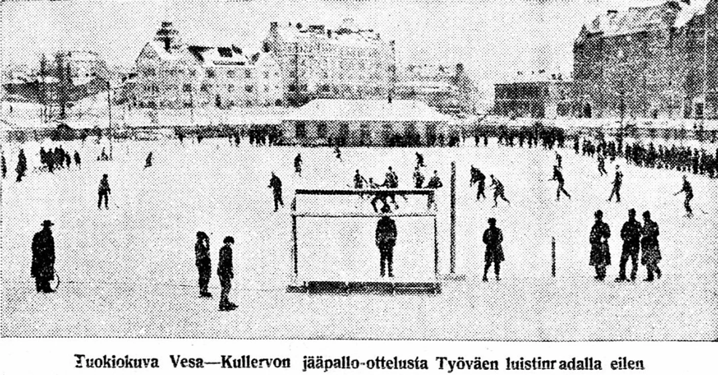 13 февраля 1927 года. Стадион «Тюёвяен луйстинрата» / «Рабочий каток». Финал чемпионата TUL по хоккею с мячом. «Куллерво» (Хельсинки) - «Веса» (Хельсинки) - 4:7; основное время игры - 4:4 (2:2). «Опасный момент у ворот «Весы» (газета «Суомен сосиалидемокраатти» от 14 февраля 1928 года)