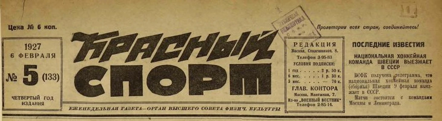 «ПОСЛЕДНИЕ ИЗВЕСТИЯ. НАЦИОНАЛЬНАЯ ХОККЕЙНАЯ КОМАНДА ШВЕЦИИ ВЫЕЗЖАЕТ В СССР. ВСФК получена телеграмма, что национальная хоккейная команда (сборная) Швеции 9 февраля выезжает в СССР. Матчи состоятся с командами Москвы и Ленинграда» (еженедельная газета «Красный спорт» № 5 от 6 февраля 1927 года).