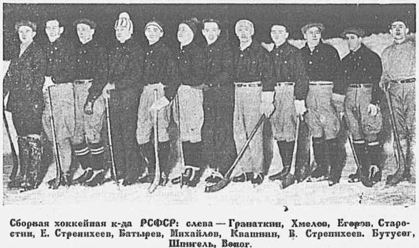 «Швеция - Р.С.Ф.С.Р. Этой игры ждали, к ней тщательно готовились. Заботами и милостью ВСФК ленинградские спортсмены рассчитывали приобщиться к заграничной технике и воочию убедиться в славных силах советской сборной команды. Ожидалась национальная команда Швеции. Трудно было не верить - заставляли верить беседы с полномочными представителями ВСФК, сообщения о тысячах проданных билетов. В итогах - семь тысяч зрителей на катке. Публику ожидало разочарование. Вместо национальной сборной Швеции, объявленной на афишах ВСФК, на лед вышли совсем еще молодые и в смысле возраста, и в спортивно – технической зрелости шведские рабочие-спортсмены. Счет 11:0 в пользу советской команды достаточно красноречив сам по себе и едва ли нуждается в комментариях. Как следует квалифицировать этот «фарс с переодеваньем», историю с жонглированием словами «сборная нации», «национальная команда» и т. п.? Еще две-три подобных «истории» и публика, у коей интерес к спорту растет сейчас стихийно, окончательно может разувериться в добропорядочности устроителей спортивных соревнований. Игравшая 13 и 14 февраля шведская хоккейная команда была составлена из рабочих металлистов, главным образом, из Стокгольма. Класс игры слабый, немногим выше гастролировавшей у нас в прошлом году латвийской команды. На льду игроки держатся довольно свободно, кое-кто умеет и поводить, но, в общем, впечатление слабое. Основной минус - полнейшее отсутствие комбинаций. Сборная РСФСР играла полностью в намеченном составе: Г. Филиппов, Полежаев, Хмелев, Квашнин, Воног, Батырев, Старостин, Шпигель, Чепцов, Михайлов и Горелкин. Шесть ленинградцев и пять москвичей. По игре со шведами судить о правильности выбора именно этого состава для сборной РСФСР, конечно, невозможно. Из 11 забитых мячей, 5 пришлось на долю В. Михайлова, два мяча забил Воног, столько же Квашнин, и по одному Шпигель и Чепцов. Играли по шведским правилам, т.е. высокие ворота (вратарь швед играл без клюшки), высокий мяч без бортиков, начало игры с «выжиманием» мяча, и т. д. У шведов лучше других был центр полузащиты Крац (он же и капитан) и вратарь Сундин; не будь последнего, счет мог бы достичь двух десятков «сухих» мячей. Игру судил Г. Фепонов, быстро приспособившийся к не знакомым для себя правилам. На другой день, играя со сборной Ленинграда, шведы проиграли 8:0» (журнал «Спартак» (Ленинград) № 8 от 20 февраля 1927 года).
