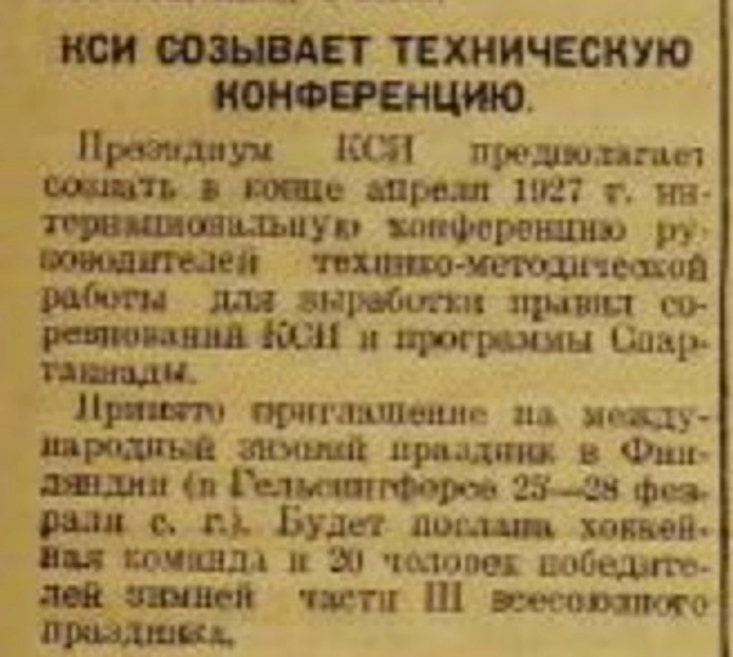 «К ПРИЕЗДУ ШВЕДСКИХ ХОККЕИСТОВ.В связи с противоречивыми слухами, появившимися вокруг приезда в Ленинград шведской рабочей хоккейной вместо отказавшейся национальной ВСФК считает необходимым дать следующее разъяснение: Высший совет физической культуры вел предварительные переговоры о приезде в СССР шведских хоккеистов с Шведским спортивным союзом* персонально через одного из руководителей этого Союза. Так как самостоятельного рабочего спортивного движения в Швеции нет, то ВСФК и полагал, что Шведский спортивный союз (буржуазный) пришлет свою хоккейную команду**. Этим объясняется широкая реклама, которую ВСФК провел перед приездом шведской команды, предвидя исключительный спортивный интерес предстоящей встрече. Лишь только по приезду шведских хоккеистов в СССР, ВСФК узнал, что эта команда не является командой Шведского спортивного союза, а носит, скорее, характер рабочей делегации, составленной исключительно из рабочих металлистов Швеции. ВСФК и ЛГСФК был оказан радушный прием шведским рабочим спортсменам, завязана на дальнейшее время связи с ними. Оповестить широкие массы публики, интересовавшейся предстоявшей встречей с шведскими хоккеистами, ввиду позднего получения сведений о действительном составе команды, ВСФК не смог, благодаря чему и создалось указанное недоразумение. Заместитель ответственного секретаря ВСФК Шардаков» (еженедельная газета «Красный спорт» № 7 от 20 февраля 1927 года).