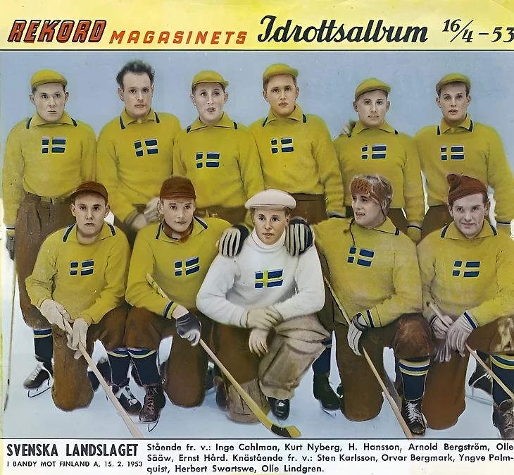 15 февраля 1953 года. Стокгольм. Олимпийский стадион. Швеция - Финляндия - 0:3. Шведская сборная - верхний ряд (слева направо): Инге Кальман (Inge Cahlman), Кент Нюберг (Kent Nyberg), Х. Ханссон (H. Hansson), Арнольд «Сладден» Бергстрём (Arnold «Sladden» Bergström), Улле Сэев (Olle Sääw), Эрнст Хорд (Ernst Hård); нижний ряд (слева направо): Стен Карлссон (Sten Karlsson), Урвар Бергмарк (Orvar Bergmark), Ингве «Иппе» Пальмквист (Yngve «Yppe» Palmqvist), Герберт Свартсве (Herbert Swartsve), Улле Линдгрен (Olle Lindgren)
