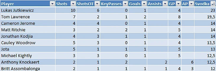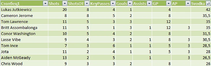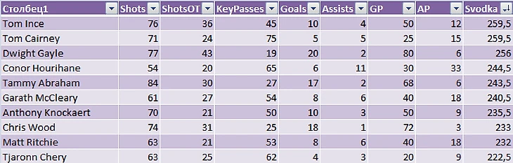 * GP (goal points), AP (assist points) - баллы, начисляемые за результативные действия. Svodka - общая сводка атакующих действий, вычисляемых по формуле, которую я сделал по своему усмотрению