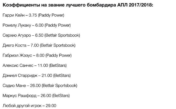 Букмекеры также предлагают поставить на лучшего бомбардира сезона. Всего за 3.75 можно поставить на третью подряд золотую бутсу Гарри Кейна (9.0), чуть ниже рассматриваются Ромелу Лукаку (9.0), Серхио Агуэро (9.0). В шестёрку вошли также Диего Коста (8.5), Габриэль Жезус (8.5) и Алексис Санчес (9.5). За ними идут "скаузеры" Дэниэл Старридж (8.0) и Садио Мане (8.5). Рэшфорд (7.5) также рассматривается в списках бомбардиров.