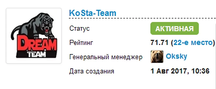По стечению обстоятельств именно моя Франшиза зарегистрировалась в первый день последнего летнего месяца, к сожалению пропустив начала сезона в РПЛ. И так прошу любить и жаловать KoSta-team. В составе 10 человек. Наша франшиза является не только интернациональной, в состав входят участники из России, Беларуси и Узбекистана, но и все мы болеем за разные клубы: Зенит, Спартак, ЦСКА, Динамо. При всем при этом в коллективе отличный климат. Это было лирическое отступление, а теперь собственно о старте турниров, в которых принимает участие франшиза: Чемпионшип, Лига 1, АПЛ и планируется Италия.