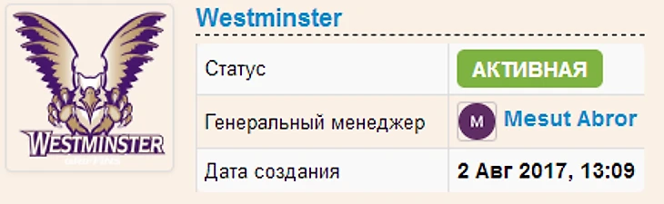 2 августа 2017 года – день рождения франшизы Westminster, генеральным менеджером которой является Mesut Abror. В составе банды 8 человек, включая ГМ. Франшизу пока что участвует лишь в АПЛ и уступив в первом туре шизе БАРС со счетом 4:2 , ребята расположились на предпоследнем, 21 месте 2 дивизиона АПЛ. Будем надеяться, что франшиза примет участие в стартующих командных турнирах Серии А, ЛаЛиги и Бундеслиги и пожелаем им успехов.