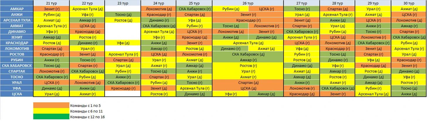 Маленький бонус - календарь на весну (кликабельно, только почему-то не хочет открываться в новом окне). Цветом обозначена не сложность и не коэфициенты, а место соперника в текущей таблице. Так можно примерно оценить, кого что ждет весной. Перенесенные матчи засунул в 26 тур по моему мнению, пока нет гарантий того что они будут отнесены именно к нему. Возможно, не самая информативная табличка, но решил выложить, раз уж она есть. Спасибо что дочитали до конца!