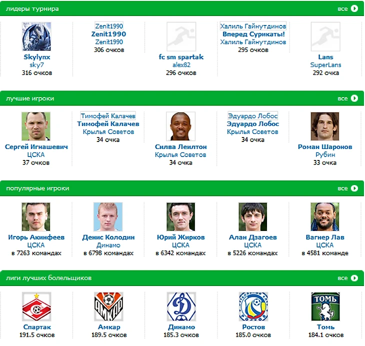 Это продолжение панели управления. Под рукой все, что нужно. Можно посмотреть лидеров турнира на данный момент времени. Также стоит отметить, о чем я забыл упомянуть ранее, что при нажатии на вкладку “Рейтинг” открывалась страница, на которой можно посмотреть положение фэнтезистов за месяц и в общем зачете.
