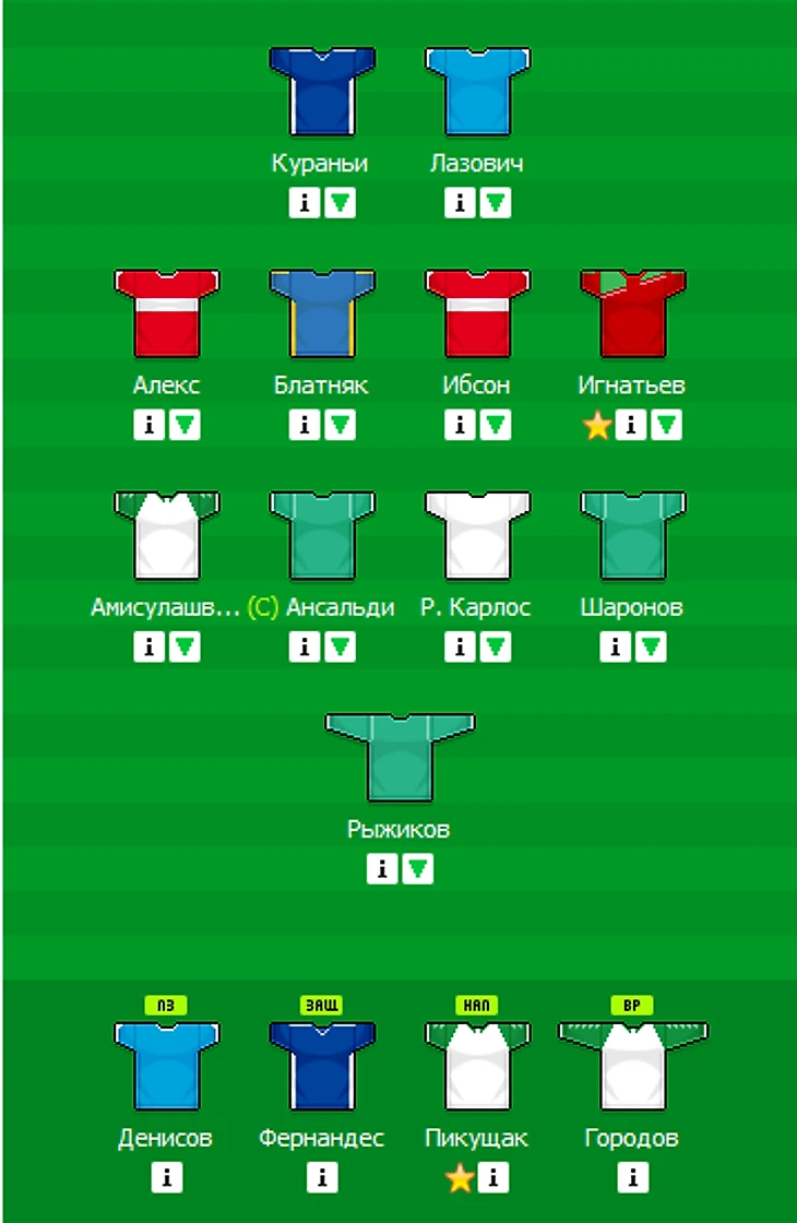 Вот такая картина получалась в итоге после сборки команды. Как видим, на поле использована схема 4-4-2, в запасе находятся 3 полевых игрока и 1 вратарь. Звездочкой отмечены игроки, находящиеся в хорошей форме, на протяжении короткого отрезка (примерно 5 туров).