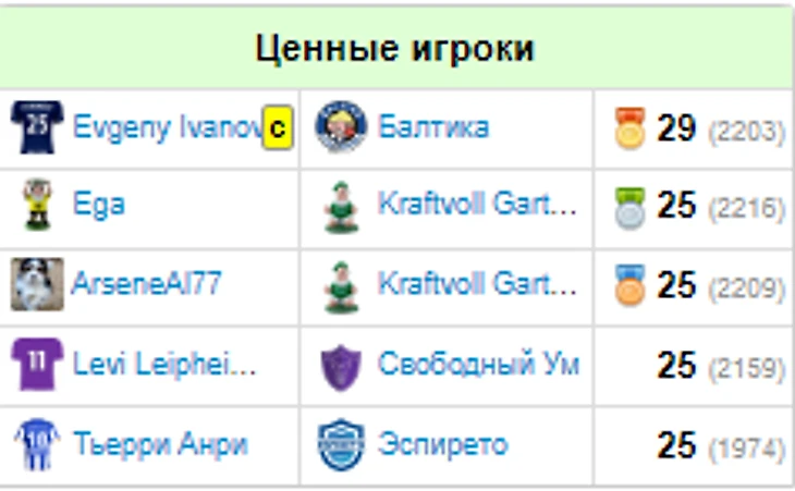 Доброго времени суток. Подводим итоги по чемпионату России. После удачного чемпионата 20-21 и выхода в Дивизион 1, конечно хотелось «продолжения банкета», выйти в элитный российский дивизион. Итоги у вас перед глазами, команда прошла турнир без падений, очень хорошо, чего только стоит серия из 8 побед подряд. За туров 4, мы уж были на чиле, обеспечив призовое место. Очень пришелся «ко двору» наш новичок Эдвард Джеймс Кенуэй, который довольно хорошо погружен в чемпионат. Он и показал лучший результат в общем зачете (13). Red_fan (33), EmAndr_BLR (87). Не смотря на поражение в квалификации кубка, думаю итоги сезона в России можно считать положительными. Спасибо всем ребятам за своевременные замены, отдельное благодарность Тьерри Анри, за готовность в любой момент подстраховать )).