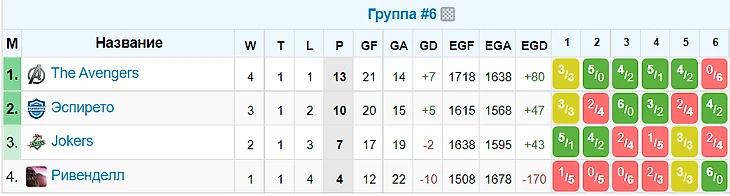 Стартовый жребий был не то чтобы легким. В группе нас ждали Авенгеры и довольно крепкие Джокеры с Ривенделом. Да и начало турнира вышло нервным - потная ничья с Авенгерами, странное поражение от Джокеров ( в том самом туре, где сайт H2H Князева сломался и давал возможность делать заморозки, уже зная итоги матчей (и угадайте кто этой возможностью попользовался? ) В общем, ситуация была сложной, но две победы над Ривенделом ее поправили так что в последнем туре мы с Джокерами в очном споре решали, кто поедет в плэйофф. К счастью в тот раз сайт Князева сработал штатно и мы прошли 1/16, а Джокеры отправились в Лигу конференций тоже прошли в плэйофф, но с третьего места.