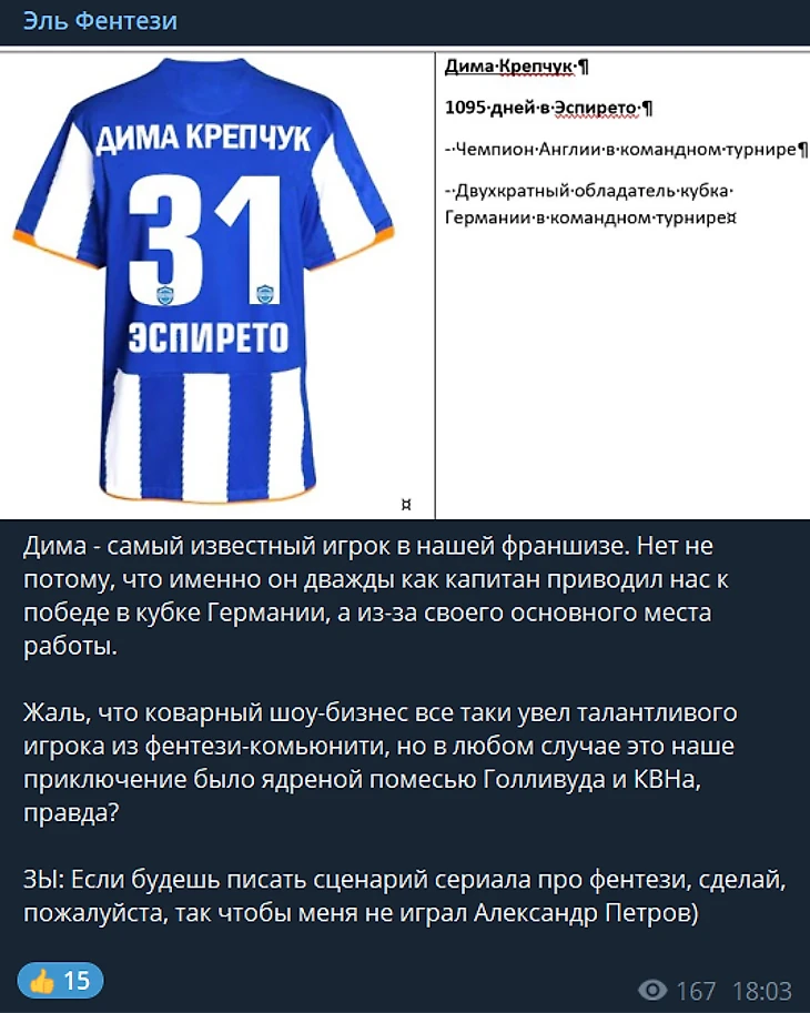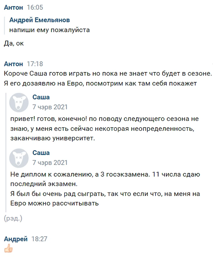 Но самый интересный момент случился у нас в личном общем зачете. Перед стартом турнира Жаромир сообщил, что его пригласили в Авенгеры и он не может отказаться. И мы начали искать человека в команду на замену. И cлучайно вспомнили, что Тесей, завершивший фэнтези в позапрошлом сезоне, говорил, что может захочет ещё вернуться. Насколько это случайно произошло, привожу пример личной моей переписки с Антон Multiplayer:
