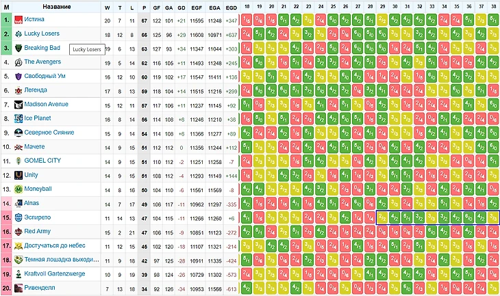Найти свою игру нам удалось только когда угроза вылета из Примеры стала совсем уж очевидной. Команда выдала героическую десятиматчевую беспроигрышную серию и до самого финиша имела шансы на сохранение прописки. Более того наш матч последнего тура прямо влиял на распределение медалей. Иронично, но нем мы выступили примерно также как во всем сезоне: выигрыш по фо, но всего лишь ничья на выходе. В итоге мы и сами вылетели и ЛакиЛузеров лишили золота.