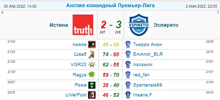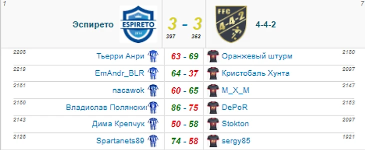 Единственный кто не поддавался панике - это red_fan. Он и в первом туре не вляпался в историю с Осимхеном и в последующем играл на каком-то запредельном уровне концентрации. Ориентируясь на него, Эспирето сначала прервал падение породистой победой над Истиной (Первое место по фо в дивизионе), а потом вернул себя в гонку и вполне мог бы добраться и до выигрыша в турнире , если бы не смазанная концовка.