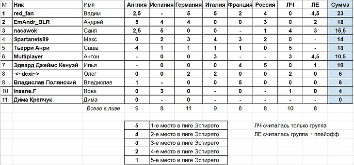 Что касается самого турнира. Как и в прошлом году отмечу, что чемпионат Франции как фэнтези-турнир лично для меня играется намного интереснее, чем, например, скучная Испания или Россия. Но в целом также считаю, что уровень знаний чемпионата здесь слабоват, сказывается отсутствие интереса к самой Лиге 1. Часто замечаю какие-то неочевидные/нелогичные пики в составах соперников, однако в первой части сезона это у соперников заходило. Ну и попадание в топ-100 ОЗ 7/8 наших игроков, конечно, можно частично объяснить меньшим кол-вом игроков в турнире, но в прошлом году в топ-100 у нас было, к примеру, всего 2 игрока. И это определённо намного более мощные индивидуальные результаты каждого нашего игрока по сравнению с прошлым сезоном.