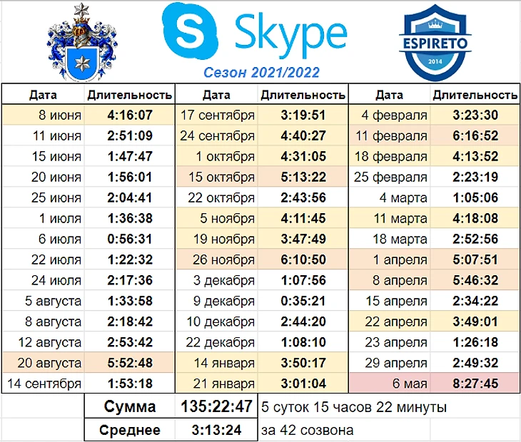 В этом сезоне решил вести статистику продолжительности наших созвонов, и вот такой получился результат.