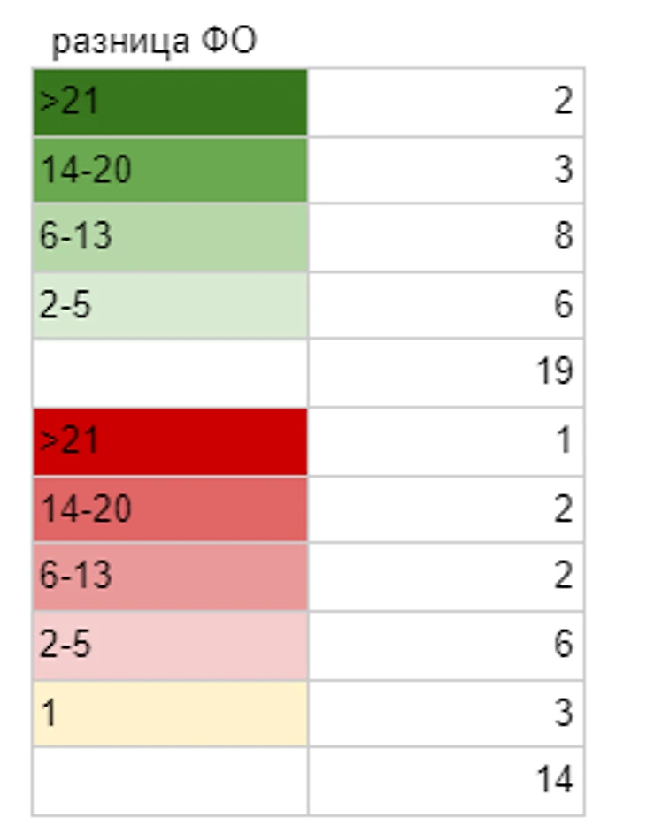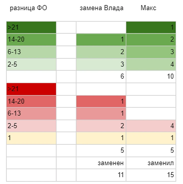 В таблице указано количество случаев, когда игрок, вышедший на замену, набрал больше/меньше замененного с соответствующей разницей ФО между ними
