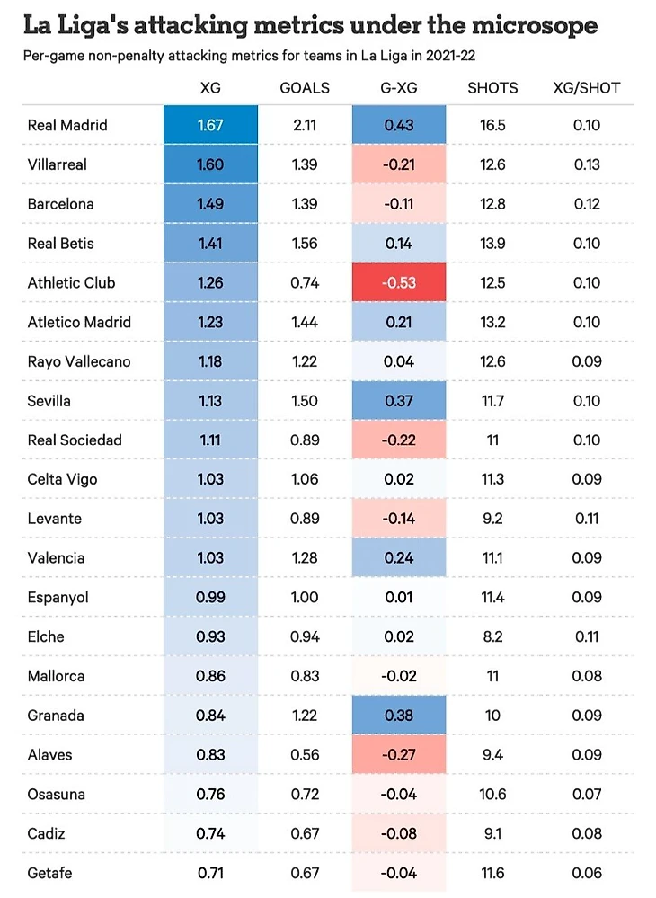 Точно так же, всего неделю назад, 0,59 гола «Атлетика» за игру при 1,29 xG говорили о впечатляюще неудачной линии атаки. Ситуация немного изменилась, когда Инаки Уильямс забил два гола в победном матче с «Бетисом» (3:1), забив всего три гола в первых 17 матчах Ла Лиги. Однако одна игра не может привести к слишком большим колебаниям - и команда Марселино по-прежнему остается самой расточительной командой у ворот соперника в Ла Лиге, с отрицательной разницей в 0,53 за игру между non-penalty xG и фактическими голами, что, вероятно, снижает их шансы на попадание в еврокубки.