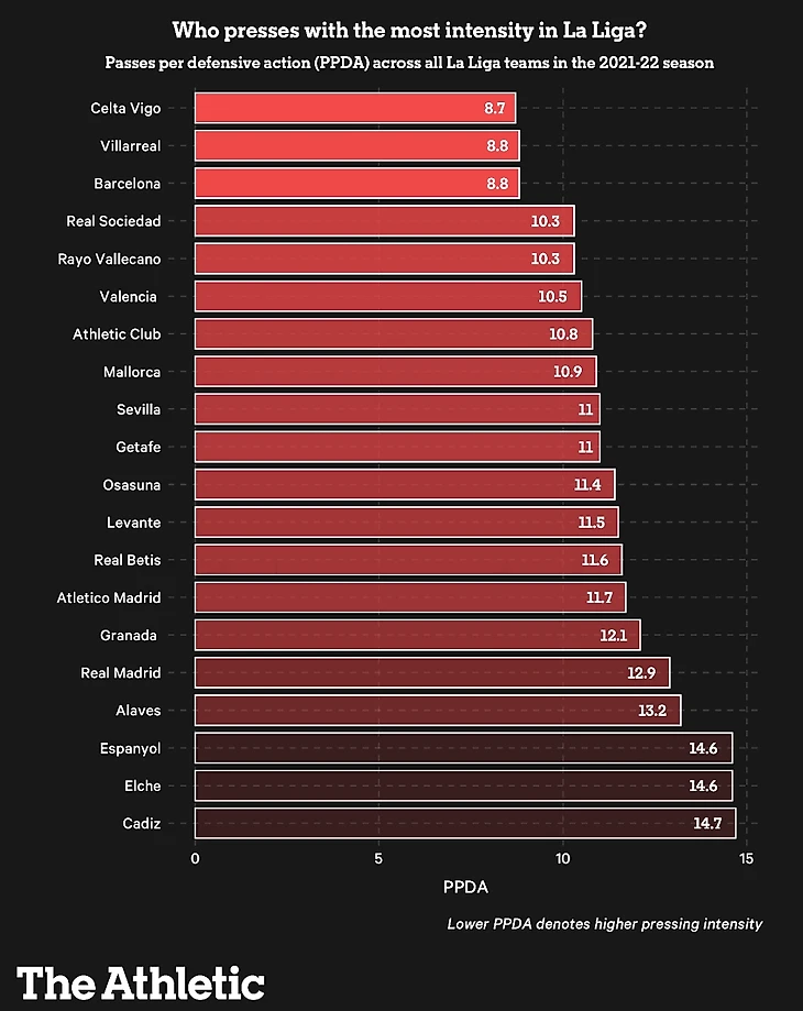 Постоянные зрители Ла Лиги не будут удивлены, увидев, что «Сельта» аргентинского тренера Эдуардо Коудета лидирует как наиболее интенсивная в прессинге команда, имея показатель PPDA всего 8,7. На «Райо» также сильно повлиял Марсело Бьелса, тренер команды Андони Ираола играл под руководством аргентинского специалиста в «Атлетике».