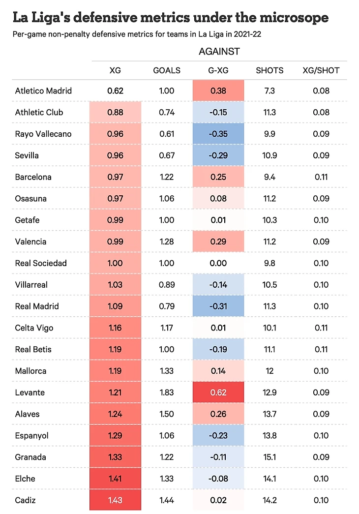 Это совпадает с тем, что «Атлетико» стал намного более атакующим за последние пару сезонов, а также с идеей, что их проблемы в этом сезоне были вызваны в большей степени проблемами в защите (подробнее об этом ниже). Также одним из факторов, по которым «Атлетико» сейчас так низко был Луис Суарес, который не забил в своих последних восьми матчах Ла Лиги, как и невезучий - Жоау Феликс, который попал в каркас ворот в последних двух играх Ла Лиги.