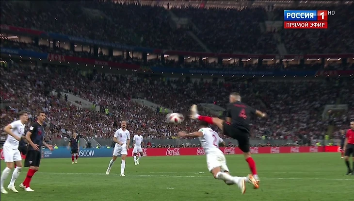 В дополнительное время, казалось, англичане сохранили побольше сил и смогут дожать соперника. Но у хорватов были свои планы на этот счёт. На исходе первой 15-минутки они устроили штурм воротам англичан, а в начале второй - забили гол. Отличился Манджукич после скидки головой всё того же Перишича. После этого Хорватия вновь, как и в матче с Россией отошла назад, изредка огрызаясь контрвыпадами, но только на этот раз победный счёт удержать сумела. Остаток матча Англия доигрывали в меньшинстве. Впрочем, даже если бы Триппьер не получил травму после четырёх использованных замен, вряд ли это что-то изменило.Перишич делает скидку головой не глядя, наудачу. Ближе к точке удара находится Стоунз, но опытнейший Манджукич гораздо раньше успеет к мячу.