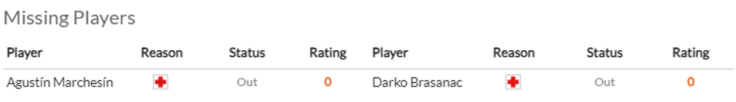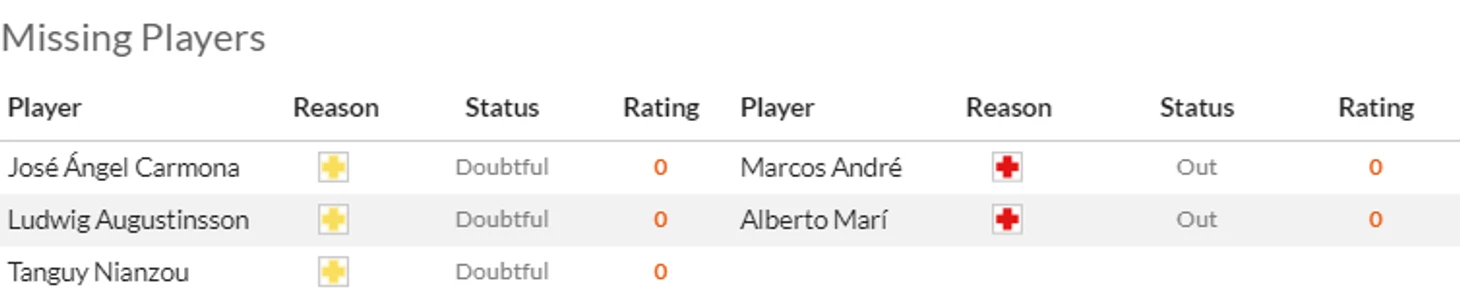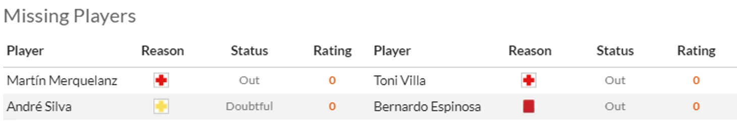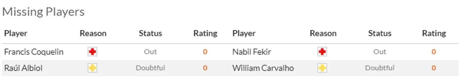 Кстати у Бетиса тоже все сложно с киперами. В том смысле что их двое и они равнозначны. Правда в первом туре в воротах огурцов видимо не будет приболевшего Браво(5,5). Но гораздо печальнее то, что Вильям Карвальо(6,5) получил повреждение и выбыл на пару недель.