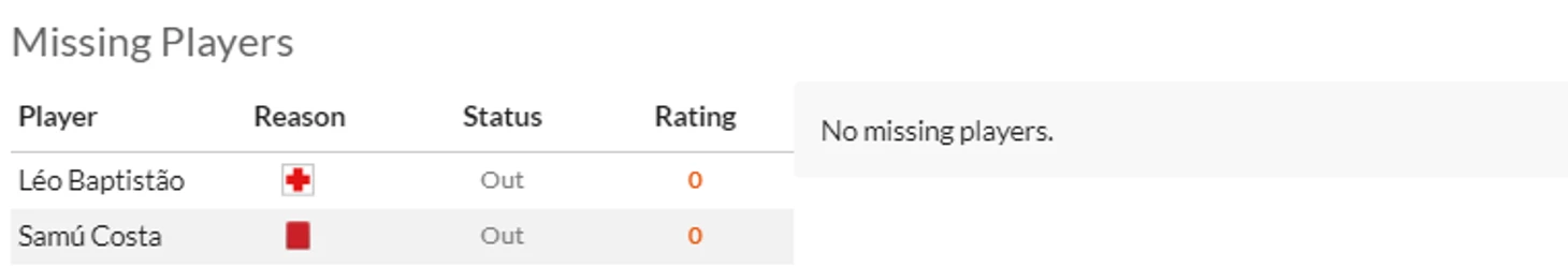 Ну и разумеется не стоит рассчитывать на приболевших Ньянзу(5,5) и Маркао(5,5) - они пока в лазарете и матч первого тура посмотрят разве что с трибуны. Что касается гостей, то они решили оставить дома и Маркоса Андре(6,5) и Кастильехо(6,5) с Джемертом(5,5)