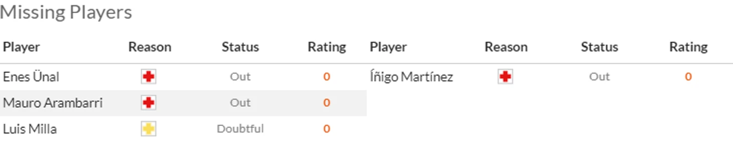 Впрочем к первому туру баски все равно не поспеют, так что придется им обходиться без Арсена.. А вдобавок еще и без травмированных Андре Сильвы(7,5) и Элустондо(6), а также без перебравшегося сегодня в Алавес Горосабеля(5,5).