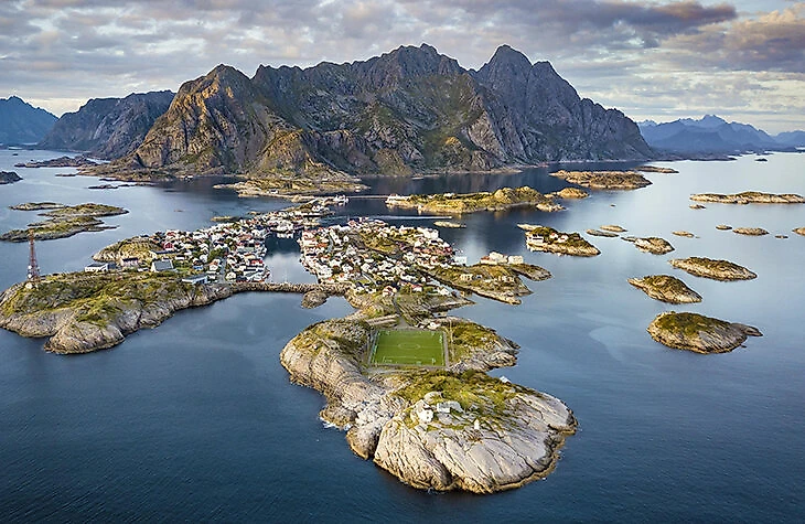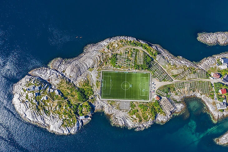 Перемещаемся на север Норвегии, на Лофотенские острова – возможно, один из самых красивых пейзажей с футбольным полем. Жаль только, что профессиональных матчей здесь не увидеть – на стадионе тренируются и играют любители. Часто туда привозят туристов, которым нравится милая и аутентичная архитектура. А еще прямо вокруг стадиона сушат рыбу.