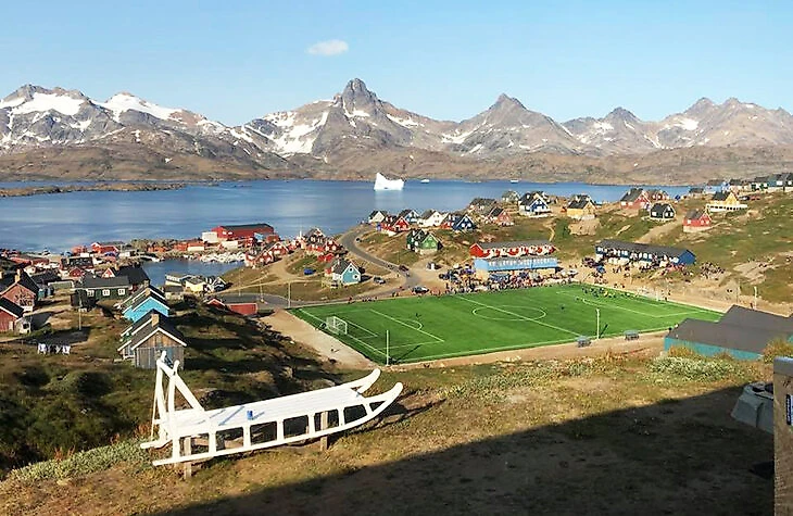 Стадион в Ангмагссалике, Гренландия. Футбол на берегу океана