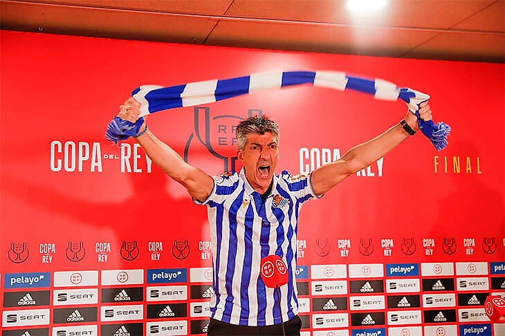 А вот отличное подтверждение того, что Альгуасиль и правда с детства за «Сосьедад»: в 2021-м клуб завоевал первый трофей за 34 года (за всю историю их шесть), тренер принялся отмечать прямо на пресс-конференции. Надел футболку, взял шарф команды – и зарядил кричалку.