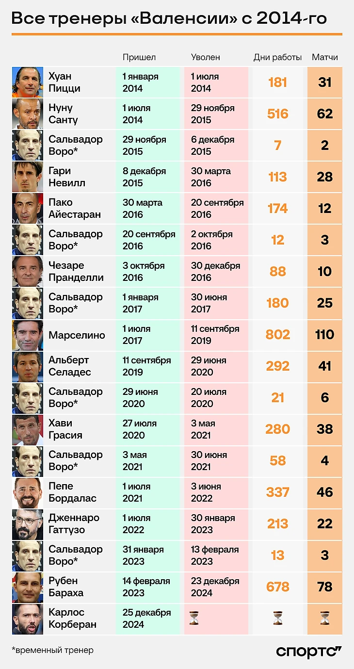 Спасает «Валенсия»: идет на самом дне Ла Лиги и перед 2025-м сменила тренера. Вместо легенды Рубена Барахи пришел Карлос Корберан из «Вест Бромвича». За 41-летнего специалиста заплатили почти три миллиона евро.