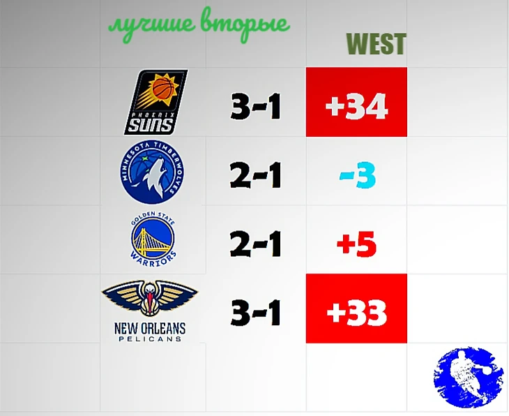 А вот Финиксу нужна большая сцена, поэтому они без фанатизма и без Кевина Дюранта - на одном Букере проехали (110-89) по страдающим от стоящего перед ними мучительного выбора Гризлис (3-12 в сезоне) у них же дома (0-7 на своей арене у Мемфиса...влияние дружеских стримов Моранта на развитие организации ещё только предстоит оценить). В итоге Финикс малой кровью получает второе место в своей группе и имеет ЛУЧШУЮ дельту забитых-пропущенных для сравнения с остальными вторыми групперами запада (+34 у Санс и +33 у НОП). А сиявший в прошлых сезонах Мемфис, выглядевший как в своё время восходящее ГСВ с новой суперзвездой (претендентом на MVP, гордо отказавшимся от звания Самого Прогрессирующего Игрока), теряют очередной сезон на мучения и потерю темпа, что в такой конкурентной среде, как НБА, быстро и жестоко наказывается новыми претендентами на небосклон и главные софиты лиги.