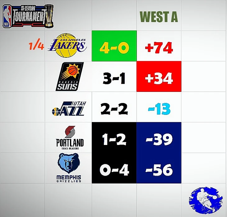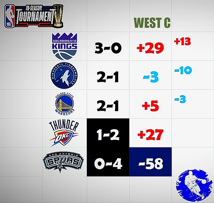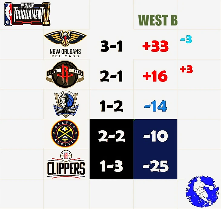 Выбиты из розыгрыша Денвер и Клипперс, Даллас ещё может накозлить взлетающему на всех парах с последнего места прошлого сезона в лиге Хьюстону, но Мавэрикс уже тоже из внутрисезонного турнира вылетели. А вот Пеликаны или Ракеты вполне могут продолжить борьбу за Кубок НБА. Конечно Новый Орлеан не будет возражать, если Дончич и Ко отметелят дома Хьюстон Удоки. Это позволит Пеликанам с чистого первого места выйти в 1/4 Кубка, а Хьюстон вылетает с результатом (2-2). Но если Рокетс смогут опозорить Даллас на их же поляне во вторник и получат результат (3-1), то Хьюстон получает ( №1) преимущество над Орлеаном за счёт личной встречи, которую они выиграли +3 в клатче (104-101). В этом случае орлеанцы занимают второе место в группе, и у них сейчас уже не лучшая дельта (З-П) среди западных вторых. То есть Пеликаны проходят дальше только в случае победы Далласа на Рокетс - Хьюстон в матче с Дончичем решит: идут дальше они или нет. Пеликанам остаётся только молиться на Луку и ждать. Миннесота может со второго места претендовать на путёвку в 1/4, но им нужна победа (+45 и крупнее), а ГСВ, если победят Менто (+9 и более) и так влезают на первый слот. Если (+8 и менее), то едут дальше по регулярке. Кингс в случае поражения ухудшает свою З-П равную сейчас +29. Так что вероятность четвертьфинала Лейкерс против Финикса - невероятно высока.