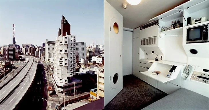 Широкую известность получило его здание Накагин Капсула-тауэр в Токио, построенное в 1972 году. Здесь была реализована его идея дома-дерева: монолитные капсулы однокомнатных квартир монтировались на ствол коммуникаций (лестница, лифт, водопровод, канализация, электричество, связь). Каждая капсула представляет собой компактную квартиру для одного человека, где есть кровать, маленький встроенный письменный стол, шкаф и небольшая душевая кабина. Монтаж одной жилой капсулы занимает 45 минут! Поэтому по мере необходимости дом может расти и без архитектора.