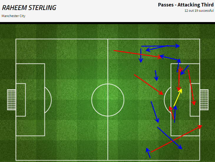 Напоследок карта передач Стерлинга в чужой трети поля в выездном матче со «Стоком», где Рахим коснулся мяча в штрафной аж 15 раз.