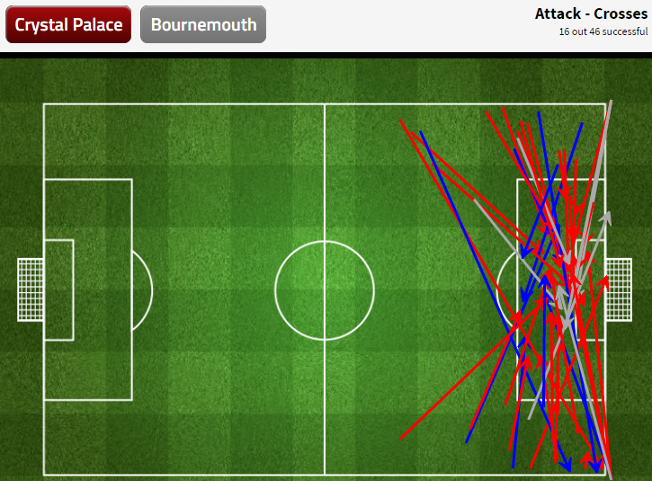 Количество кроссов от «КП» действительно потрясает воображение — 198 за 7 матчей, что является лучшим показателем лиги с большим отрывом. 107 из этих 198 кроссов на счету Таунсенда (56) и Панчона (51). Но еще интереснее статистика эффективности. Эндрос и Джейсон накопили 35 удачных кроссов на двоих — у 11 команд лиги меньше. Апогеем стал домашний матч 3-го тура против «Борнмута», где «Кристал Пэлас» выполнил 46 кроссов.