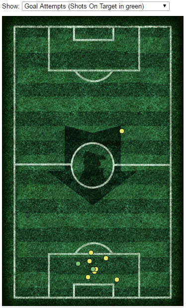 38 ударов по воротам, 24 удара из пределов штрафной, 13 ударов в створ, 87 удачных передач в чужую треть поля, 227 касаний мяча на чужой трети поля, 126 полученных передач на чужой трети поля