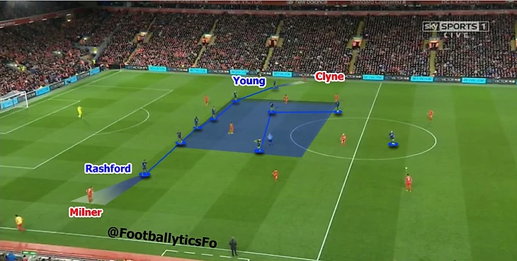 «Юнайтед» не сидел только лишь на своей половине (использовали то, что Моуринью любит называть middle block), но в то же время проводил без мяча намного больше времени, чем, судя по цитате, ожидал и хотел Клопп. Такой сценарий требовал от «Ливерпуля» грамотного использования пространства в позиционных атаках. Но его не было: во-первых, из-за нехватки сыгранности тройки центра поля («Ливерпуль» начал матч без Лалланы и Вейналдума), во-вторых, из-за индивидуально слабой игры Эмре Джана, который регулярно принимал ужасные решения, как в плане движения, так и в плане передач.