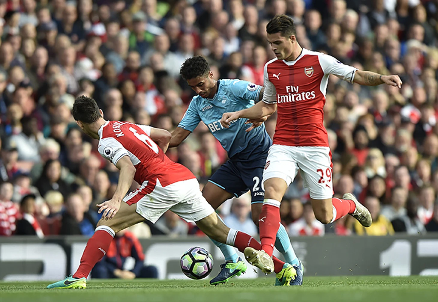 Джака обживается в новой роли. Привезенный гол и удаление создали плохой фон для оценки игры швейцарца, однако нельзя не отметить его важное влияние на игру. Помимо статистического вклада в защиту – 2 отбора, 5 перехватов, 10 подборов (очень прилично за неполный матч), – Джака оказывает серьезное влияние на построение атаки: например, типичная комбинация «Арсенала» с выходом из обороны, когда Джака, Санчес и Ивоби образуют треугольник на левом фланге, а затем следует быстрая диагональная передача на другой фланг на Беллерина или Уолкотта. Если в «Гладбахе» Джака был глубинным плеймейкером – в большинстве случаев располагался глубоко, а в начальной фазе атаки опускался между центральными защитниками, то теперь он часто занимает более высокие позиции – Мустафи и Косьелни отлично пасуют и не нуждаются в дополнительном игроке в линии, им наоборот нужны адресаты для вертикальных передач.