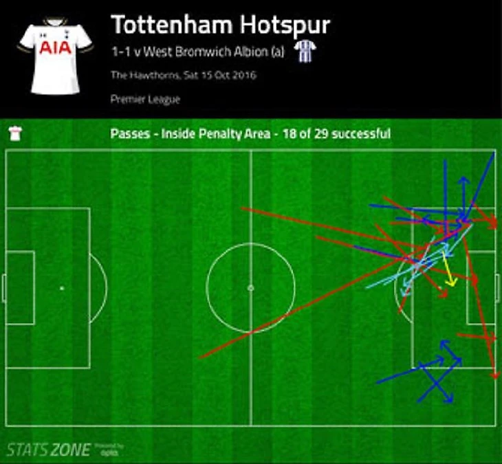 «Вест Бром» не справляется с давлением на правый фланг. Не секрет, что «Тоттенхэм» очень любит атаковать через левый канал и большинство своих шансов создает оттуда. У «Вест Брома» в целом уязвимы оба фланга защиты – справа Доусон располагается слишком узко, слева играет номинальный правый защитник Ньом, однако «шпоры» привычно атаковали по левому флангу, проведя через него 44% атак, и гол Алли пришел как раз после атаки через эту зону. Но дело не только в голе – там регулярно создавались ситуации 1 в 1 для Алли, постоянно подключался Бен Дэвис, туда смещался Эриксен, был активен Ламела (или Сиссоко, когда в один момент произошла смена флангов) – «шпоры» всячески перегружали пространство, стараясь по максимуму использовать левый канал и создав на выходе много шансов через него.