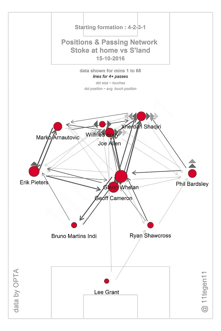 «Сандерленд» дает блистать связке Шакири-Арнаутович. Статистика «Стока» говорит (во многом справедливо, но нужно делать скидку на быстрый гол и то, как он помогает таким командам вести игру) о практически идеальном балансе команды Хьюза в матче против «Сандерленда». Комфортный перевес и по владению (57%) и по ударам (17-11), доминирование по остроте моментов, при этом основным методом созидания были передачи вразрез (5 штук, 4 у одного Шакири).